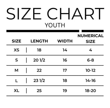 Youth Sizes: XS – XL (typically corresponds to kids' ages/grades: XS ≈ 4-5, S ≈ 6-8, M ≈ 10-12, L ≈ 14-16, XL ≈ 18).